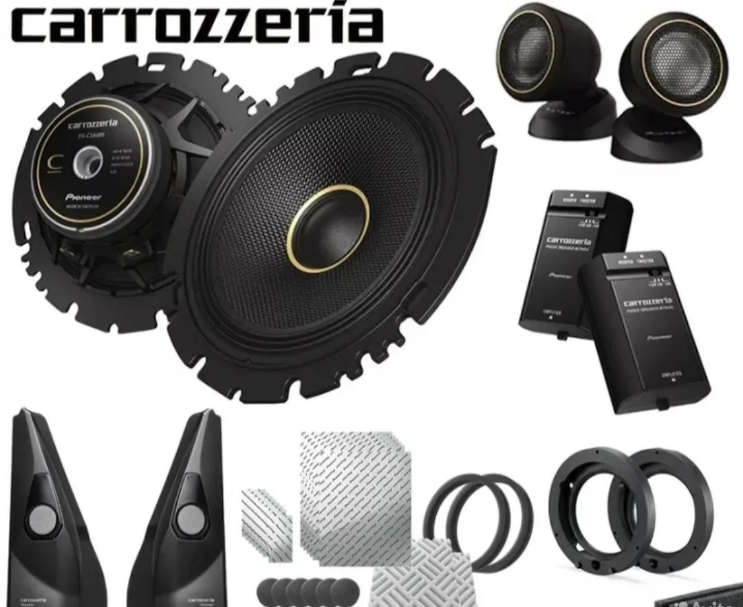 Комплект акустики с подиумами Carozzeria для Suzuki Jimny 64,74W состоящий из низкочастотных динамиков TS-C1640S диаметром 160 мм.,твитеров UD-K301 29 мм., коннекторов, адаптеров, крепёжного комплекта.